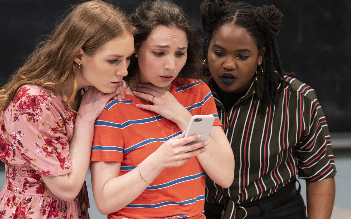 Filled with pop-culture references – lots of Taylor Swift, Beyoncé, Lizzo, Lorde, and even fashion guru Tim Gunn’s catch phrase “make it work,” the play’s two hours with a fifteen-minute intermission moves quickly as action unfolds in many scenes scattered throughout a semester.