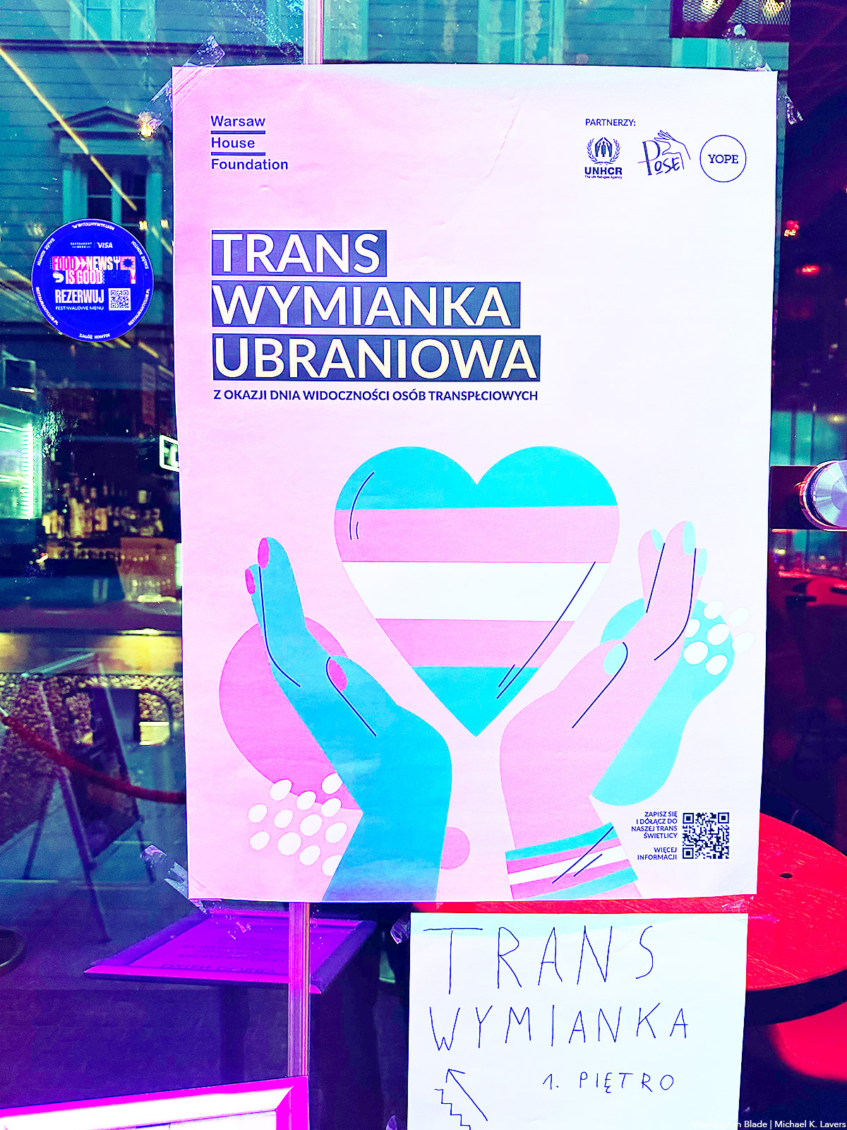 A mural in Warsaw, Poland. (Washington Blade photo by Michael K. Lavers)La Pose, a gay bar in Warsaw, Poland. (Washington Blade photo by Michael K. Lavers)The Warsaw House Foundation on April 8, 2024, hosted a clothes swap for transgender people at La Pose. (Washington Blade photo by Michael K. Lavers)
