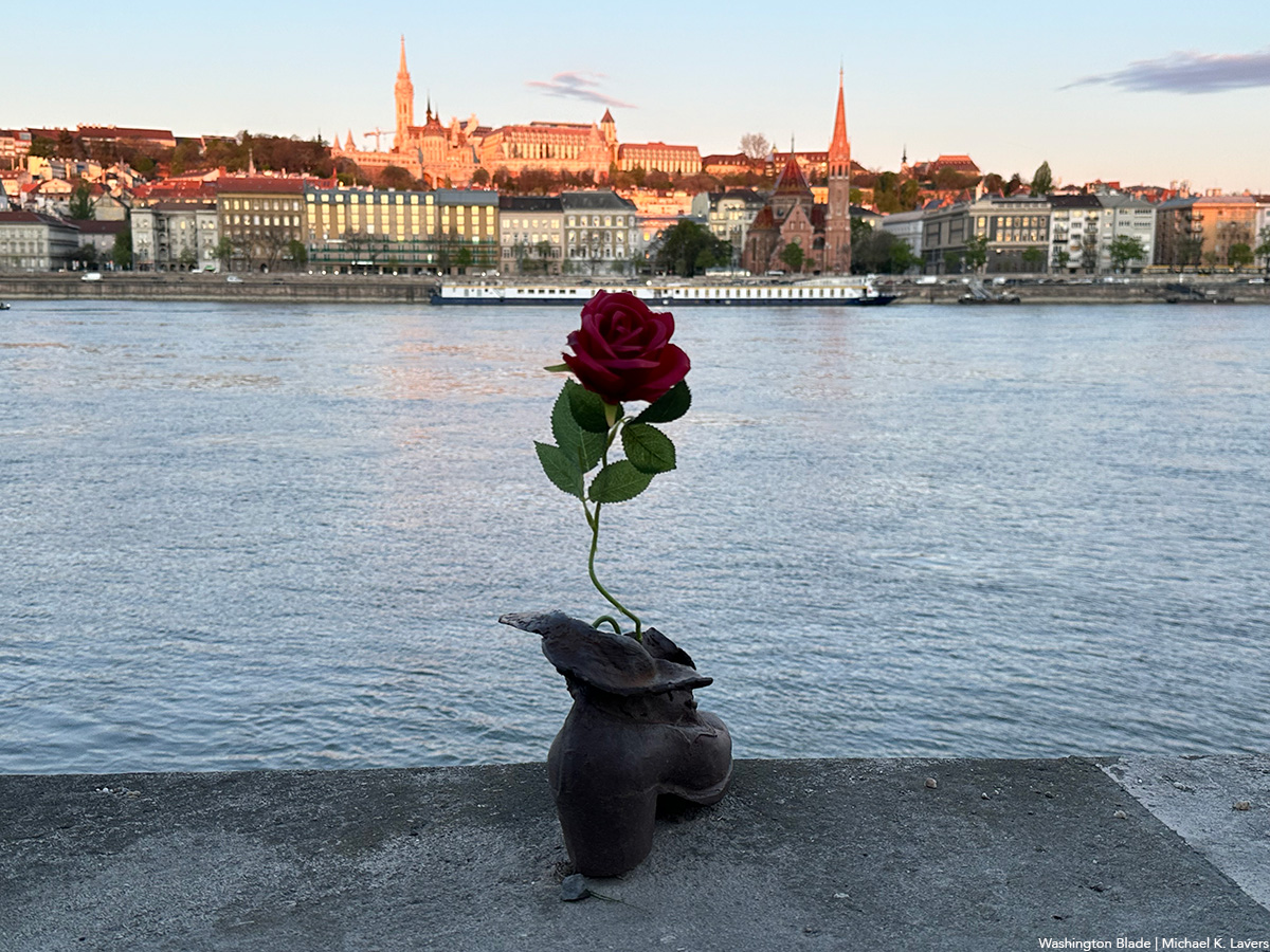 A billboard at Budapest Ferenc Liszt International Airport in Budapest, Hungary, on April 2, 2024, proclaims the country to be “family-friendly.” (Washington Blade photo by Michael K. Lavers)Part of the Shoes on the Danube Bank, a memorial to Hungarian Jewish people who the Arrow Cross Party, a fascist Hungarian militia, massacred during World War II. (Washington Blade photo by Michael K. Lavers)Posters on the Dohány Street Synagogue’s fence in Budapest, Hungary, with pictures of Israelis who Hamas militants from the Gaza Strip took hostage on Oct. 7, 2023. Carmel Gat’s sister-in-law, Yarden Roman-Gat, was among the hostages released last November. Roman-Gat’s brother, Gili Roman, is a gay man who lives in Tel Aviv, Israel. (Washington Blade photo by Michael K. Lavers)A falafel restaurant in Budapest, Hungary, with a decal on the window that notes it welcomes LGBTQ customers. (Washington Blade photo by Michael K. Lavers)The drink menu at CoXx, a gay cruising bar in Budapest, Hungary. (Washington Blade photo by Michael K. Lavers)An anti-transgender book for sale in a bookstore in Budapest, Hungary, on April 4, 2024. (Washington Blade photo by Michael K. Lavers)The Hungarian Parliament in Budapest, Hungary, on April 4, 2024. Prime Minister Viktor Orbán and his government over the last decade has cracked down on LGBTQ rights in the country. (Washington Blade photo by Michael K. Lavers)A UNHCR-affiliated community center for refugees in Kraków, Poland, on April 5, 2024. (Washington Blade photo by Michael K. Lavers)A picture of Polish-born Pope John Paul II inside St. Catherine of Alexandria Church in Kraków, Poland. The Roman Catholic Church remains a powerful institution in Poland. (Washington Blade photo by Michael K. Lavers)An anti-Russian President Vladimir Putin sticker on a streetlight in Kraków, Poland, on April 6, 2024. (Washington Blade photo by Michael K. Lavers)Posters at Lindo Bar, a gay bar in Kraków, Poland. (Washington Blade photo by Michael K. Lavers)Patrons at Lindo Bar, a gay bar in Kraków, Poland, on April 6, 2024. (Washington Blade photo by Michael K. Lavers)Magda Dropek votes in Kraków, Poland, on April 7, 2024. (Photo courtesy or Dropek’s X account)Auschwitz I camp in Oświęcim, Poland, on April 7, 2024. (Washington Blade photo by Michael K. Lavers)